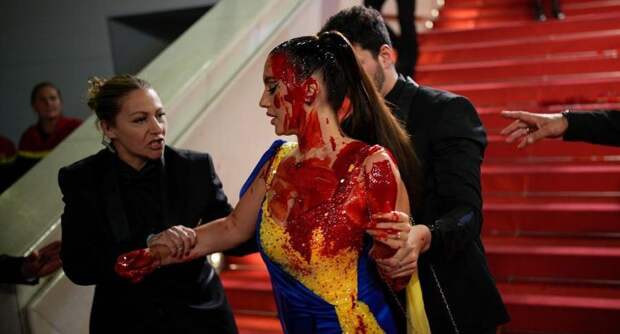 Украинская блогерша Илона Чернобай устроила провокацию на Каннском фестивале. На красной ковровой дорожке она облилась бутафорской кровью, которую пронесла с собой в пакетах за пазухой, написала La Depeche.