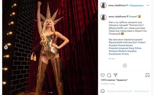 Об этом Ризатдинова рассказала в новом посте на своей странице в Инстаграм, пишет Politeka.net. «Узнали? Уже в эту субботу смотрите шоу звёздных пародий "Липсинк Батл" с моим участием. Предстану перед вами в образе Оли Поляковой. Как вам такое перевоплощение?», - написала гимнастка. На снимках она действительно предстала в образе эпатажной Суперблондинки. Так, Ризатдинова облачилась в золотое боди с фирменным лифом Поляковой в виде выпирающих конусов, высокие сапоги и огромный головной убор в виде звезды. Дополнили образ Ризатдиновой парик со светлыми волосами и яркая красная помада. Украинцы тут же принялись комментировать пост знаменитости. «Я думаю чего Полякова высветилась, если я на неё не подписана, один в один», «Нереальная. Простите меня Оля, но это даже лучше оригинала», «Вау можете теперь двойником подрабатывать», «Лучшее перевоплощение», «Люли-люли получше чем у Оли», - пишут люди. Напомним, фаворитка Ямы из "Танців з зірками" стала копией Каменских, кинув вызов Горбунову: "До встречи на...". Как сообщала Politeka, фаворитка Влада Ямы из "Танців з зірками" Ризатдинова сверкнула точеной фигурой в фитнес зале: "Можно загореться". Также Politeka писала, что фаворитка Ямы из «Танців з зірками» взбодрила пикантными танцами в обтягивающих лосинах: «Вас расслабят…».