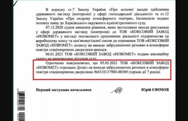 Хотя на сессии горсовета он обещал принять депутатское обращение к президенту, Верховной Раде и Генеральной прокуратуре с соответствующими требованиями Государственная экологическая инспекция в Харьковской области дала разрешение харьковскому "Коксовому заводу "Новомет" на осуществление выбросов загрязняющих веществ в атмосферу сроком на 7 лет.