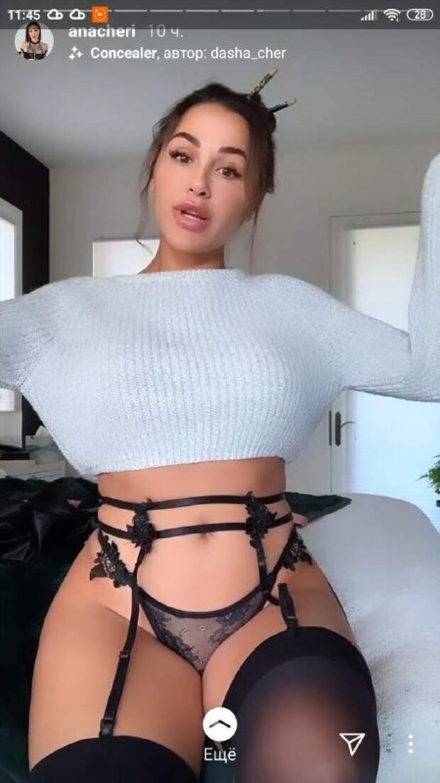 "Вкусненькая" красотка позировала в уютном коротком свитере-топе с длинными рукавами. Чери вниз надела красивое белье с подвязками. Тоненькие лямки с цветочками обвили талию модели. Они удерживали черные чулки, выглядывающие на фото. Трусики также держались на тонких лямках. Примечательно, что ткань была полупрозрачной и едва ли из-под нее не показывалось самое откровенное. Волосы красотка убрала вверх и закрепила длинными палочками. Макияж лишь подчеркнул красоту знаменитости. Кадры не собрали много лайков и комментариев, ведь в сторис нет такой возможности. Напомним, Ана Чери позировала в белом халатике и без белья. Волосы у красотки были красивыми, и образ дополнила звезда распущенными волосами. Модель закрыла глаза от удовольствия, сев на край ванной. Девушка была на отдыхе, а в руках держала пустой бокал. Звезда на второй вкладке показала ролик, где демонстрировала океан и бассейн. Ранее мы писали, что Ана Чери без стеснения подчеркнула свои достоинства жарким образом. Красотка предстала в спортивном сером костюме, показывая идеальный «орех» - накачанные ягодицы, над которыми так долго работала. "Кто занимается со мной сегодня утром для HIIT с фокусом на нижнюю часть тела? !", - написала фитнес-модель. Напомним, Ана Чери забыла про стыд и сдавила аппетитные размеры прямо на камеру А еще Politeka писала, что соблазнительная Ана Чери порадовала, обтянув свой упругий "орешек" экстра мини Также Politeka сообщала, что Ана Чери поиграла на камеру своими "ягодками" в невидимом белье
