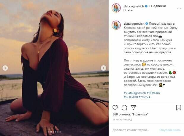 net со ссылкой на страничку знаменитости. "Спасибо за неравнодушие! Спасибо, что делитесь со мной своими мыслями. Я это очень ценю и в подобные моменты у меня появляется ещё большее ощущение СИЛЫ! Мне так важна Ваша поддержка. Да, я чётко понимаю, что мои заявления могут некоторых разочаровать, повергнуть в шок, вызвать недоумение... Но. Я хочу здесь делиться своими мыслями, позицией, взглядами на жизнь", - написала девушка. Фанаты поставили почти 10 тысяч лайков и написали комментарии: "Умная и красивая", "Сама нежность", "В тенетах владений цирцеи", "Вы очень красивая!", "Очень красиво, нежно и женственно", "Убиваешь наповал , своей красотой !!". Сообщалось, что известная украинская певица Злата Огневич всегда выглядит прекрасно и вновь доказала это серией новых кадров. "Первый раз еду в Карпаты такой ранней осенью! Хочу ощутить всё величие природной стихии и набраться сил. Вспоминаю книгу Уласа Самчука «Гори говорять» и то, как сочно описан гуцульский быт, традиции и сама психология наших предков. Напомним, Злата Огневич подчеркнула идеальные изгибы черным шелком А еще Politeka писала, что Злата Огневич искупалась в лучах солнца посреди улицы и решилась на откровение Также Politeka сообщала, что Злата Огневич искупалась в лучах солнца посреди улицы и решилась на откровение