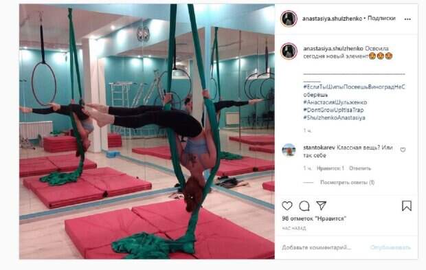 Известная актриса Анастасия Шульженко, которая стала популярной после романа с Тарзаном, показала свои умения в спортзале На кадре звезда видела в воздухе, держась за гимнастические полотна. Девушка выгнулась назад, а голова была внизу. Анастасия хвасталась новым элементом, который удалось ей разучить.