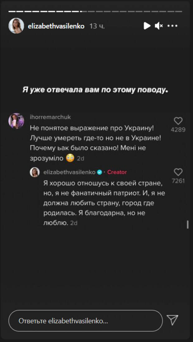 Недавно Василенко дала интервью YouTube-каналу «Пушка», в котором было несколько шокирующих заявлений. Сначала актриса призналась, что на одной из вечеринок в Москве ее изнасиловали. Это произошло, когда девушке было всего 17 лет. Также украинка заявила, что «лучше сдохнуть в России, чем в Украине». Это высказывание и отрицание российской агрессии привели к тому, что Лизу добавили в базу сайта «Миротворец». Знаменитость не сдержалась и записала гневное сообщение у себя в Инстаграм, укрыв матом украинцев. «У меня два высказывания по этому поводу. Первый – пи*дец. Второй – обращаюсь к фанатичным патриотам, которые это сделали: ребят, я не обязана любить свою страну только потому, что я в ней родилась, выросла», - подчеркнула Василенко. Также она завила, что скандал раздули «конченные СМИ» и вновь выругалась матом. Напомним, что юная звезда "Школы" в сетчатых колготках неприлично задрала юбочку: "Трудные подростки". Как сообщала Politeka, жуткая участь настигла юную звезду сериала "Школа" в Москве, вскрылись подробности: "Помню, что он сверху…". Также Politeka писала, что звезда "Школы" Лиза Василенко с высунутым языком удивила кадрами с овечкой: "Москва тебя изменила".