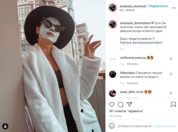 На ней был черный лифчик и накинутое сверху белое пальто. Дополнили лук стильная шляпка и необычной формы солнцезащитные очки. "Изюминкой" стала косметическая тканевая маска на лице. Анастасия несколько манерно вскинула подбородок и руку - в комментариях из-за этого ее даже сравнили с актрисой Одри Хепберн. "Если бы мужчины знали, чем занимаются девушки, когда остаются одни. Ваши предположения ?)", - спросила певица у подписчиков. Пользователи кинулись обсуждать увиденное: "Становятся такими, какими их никто не видит)" "Кайф
