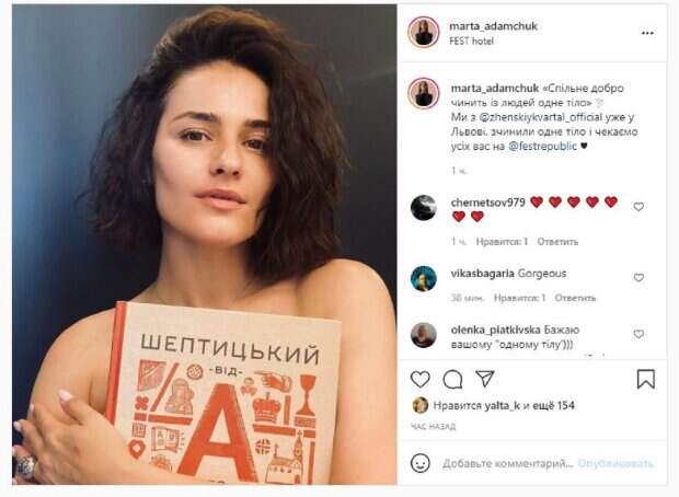Девушка также активно ведет социальные сети, где делится с фанатами всем интересным. На новом фото Марта показалась без одежды и белья. Красотка позировала крупным планом, прикрывшись книгой Шептицького, чтобы не показать ничего лишнего. "Совместное добро делает из людей одно тело". Мы с Женским кварталом уже во Львове, сделали одно тело и ждем всех вас", - написала Адамчук. Фанаты поставили более 100 лайков, включаяя жену Кошевого, а также написали комментарии: "Безумно красивая", "Желаю вашему "одному тело" получить максимум оваций от львовского товарищества". Напомним, брюнетка из "Женского квартала" в белом платье с вырезом заставила глотать слюнки А еще Politeka писала, что экзотическая красотка из "Женского квартала" показала фигуру, сбросив лифчик перед подругой Также Politeka сообщала, что завидная красотка из "Женского квартала" взбудоражила видом в платье с крупным вырезом