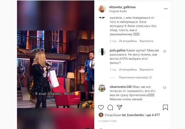 » - сказал Киркоров. «Я что? Боже, какой кошмар… Я еще поживу, Филя» - ответила Пугачева. «Я просто хотел попрощаться на всякий случай…», - начал было оправдываться Киркоров, но вышло еще хуже. «Я все понял, что ты имел ввиду, и Алла поняла», - ответил Галкин. Отметим инцидент вызвал бурную реакцию пользователей Сети. Многие раскритиковали выходку Киркорова, которую сочли наглой и неуместной. «А Филя, как всегда, невпопад... вот уж недалекий», «Шутки как у Бузовой, с кем поведешься от того и наберешься. Алла молодец! К Филе отнеслась без обид, то есть, как к умалишённому», «Да, надо же быть таким беспардонным мужчинкой», «Да что тут смешного??!!!Филя не понимает, что на все воля Божья и не известно, кому сколько назначено на этой Земле жить», «Какие же вы все веселые!! Кому-то надо думать чтобы написать фельетон. А вы просто разговариваете на этом языке», «Как приятно, когда люди с чувством юмора», «Улыбайся не улыбайся, но на мой взгляд Некрасивая ситуация здесь получилась. Филя повёл себя некорректно со своим прощанием, лишь бы хоть как-то коснуться Аллу, показать свою близость с ней, которой уже давно нет. Алла и Максим конечно молодцы, юмором все сгладили», пишут в Сети. Напомним, Пугачева с сыном и внучкой засветилась в деревенском магазине, Галкин удивил кадрами: "Такие простые и настоящие" Как сообщала Politeka, Киркоров взвизгнул из-за 10-летней дочери Ани Лорак в купальнике: "Как вытянулась! " Также Politeka писала, как изменилась внешность Пугачевой рядом с Галкиным, показательные фото: "Прошло 23 года"