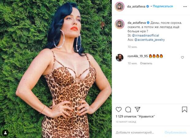 Горячая брюнетка позировала возле живой изгороди, поставив руки на пояс. Невозможно не восхититься ее "осиной" талией. Крупные серьги-кольца и яркий макияж дополнили роскошный лук. "Дамы, после сорока, скажите, а потом же леопард ещё больше нра?", - поинтересовалась у поклонниц Астафьева. Пользователи кинулись честно отвечать и сошлись на мнении, что Даше в любом возрасте "леопард" к лицу: "Шикарная!!!
