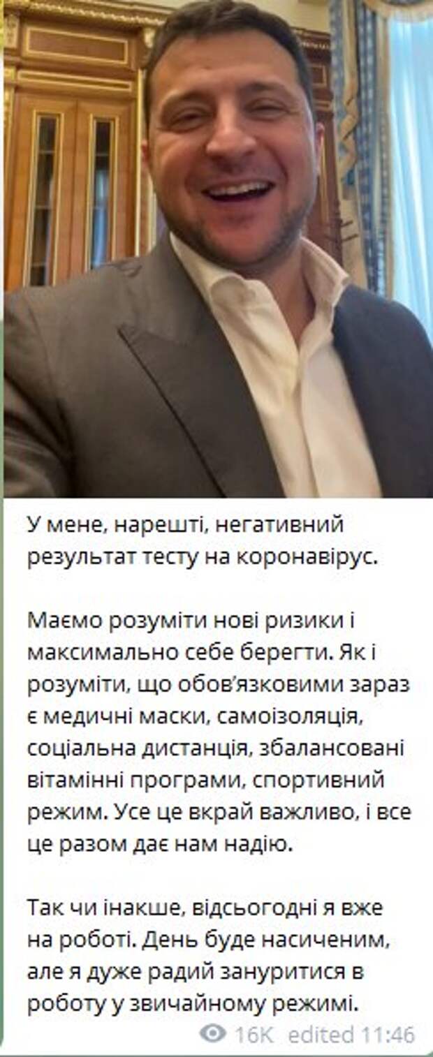 Украинский президент Владимир Зеленский рассказал о своем состоянии Как передает Politeka.net, гарант сделал заявление, опубликовав соответствующие кадры в своем Телеграм-канле. По словам Зеленского, лечение прошло успешно, и очередной тест на китайский вирус оказался отрицательным. Таким образом, добавил президент, он возвращается к работе в обычном режиме.