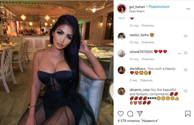 Бахари постоянно веселится в ресторанах, модных заведениях и кафетериях. Во время одного из таких вечеров она показала необычный наряд – черное полупрозрачное платье с сеточкой, в котором смогла выгодно подчеркнуть достоинства и удивить сменой имиджа. Гюль дополнила наряд аккуратными украшениями и завершила «лук» ярким макияжем с акцентом на глаза. «Ничего себе невероятное; Ты моя мечта