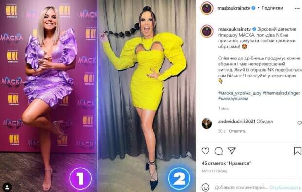 Перед шоу певица до мелочей продумывает каждый свой наряд и имеет ошеломляющий вид. В Инстаграм-аккаунте «Маски» показали два аутфита певицы и попросили оценить, какой лучше. На первом фото Настя выглядит, как настоящая конфетка. На ней надето сиреневое платье с внушительным декольте объемными рюшами, Свой образ красотка соединила с открытыми босоножками на каблуке и украшениями. Прическа у Насти- гладкое каре. На втором снимке Каменских позирует в желтом мини-платье по фигуре с объемными плечами и длинными рукавами, а также эффектными вырезами в зоне декольте. Дополнила игривый наряд певица черными туфлями с острым носком и длинным хвостом. В комментариях оценили луки Каменских, однако некоторые попросили уделить больше внимания одежде другого звездного детектива. "Лучше переоденьте Андрея Данилко", - написали в сети. Напомним, певица Каменских в необычном корсете показала, как идеально подчеркнула фигуру А еще Politeka писала, что звезда "Маски" Каменских в маленьком платье блеснула формами в необычном вырезе Также Politeka сообщала, что Настя Каменских в темных штанах в облипку продемонстрировала свою "Ким" у элитного авто