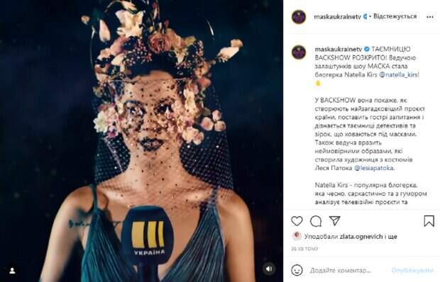 В ролике, который опубликовали в соцсети Нателла появилась в загадочном образе – в темном платье и объемном цветастом головном уборе с темной вуалью. За этим аксессуаром почти не видно лицо девушки, в глаза бросаются только ее черные губы. В подписи к видео рассказали о новой ведущей: "ТАЙНА BACKSHOW РАСКРЫТА! Ведущей закулисья шоу МАСКА стала блогера Natella Kirs. В BACKSHOW она покажет, как создают самый загадочный проект страны, поставит острые вопросы и узнает тайны детективов и звезд, которые прячутся под масками". Пользователи в комментариях тут же начали комментировать видео, многие удивились, кто стал ведущей бэк-шоу "Маски": "Ого, вот это новости", "Ого, неожиданно. Не думал, что вы сделаете ее ведущей", "Вау! Поздравляю, Нателла", "Теперь мы узнаем, что же там за кулисами", "Что я и говорил! Разгадано". Напомним, "Жена Олега Винника": украинцы назвали, кто может скрываться под Маской надменной Пиковой Дамы. Как сообщала Politeka, Новый участник шоу "Маска" в самом сложном костюме произвел настоящий фурор: "Вау, это…". Также Politeka писала, что "Вика из НеАнгелов или Фреймут": красавица Фея в шоу Маска поставила украинцев в тупик.