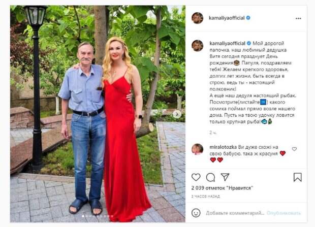 На новых фото красотка показалась в компании своего отца. У Виктора (так зовут мужчину), сегодня день рождения. На других кадрах можно увидеть его в молодости, а также маму Камалии, на которую похожа очень певица. "Мой дорогой папочка, наш любимый дедушка Витя сегодня празднует День рождения. Папуля, поздравляем тебя! Желаем крепкого здоровья, долгих лет жизни, быть всегда в строю, ведь ты - настоящий полковник! А ещё наш дедуля настоящий рыбак. Посмотрите(листайте) какого сомика поймал прямо возле нашего дома. Пусть на твою удочку ловится только крупная рыба", - написала Камалия. Фанаты поставили более 2 тысяч раз и написали комментарии: "Вы очень похожи на свою бабушку. Такая же красивая", "Камалия, Вы ,похожи на свою бабушку", "С Днём рождения папу! Крепкого здоровья!", "Мои искренние поздравления Анатольевичу))) Многая лета в здравии и окружении близких)))". Напомним, на самую богатую певицу Украины набросились с обвинениями, артистка не сдержалась Также Politeka писала, что самая богатая певица Украины без макияжа променяла лазурные пляжи на озера под Черниговом А еще Politeka сообщала, что самая богатая певица Украины поразила кадром с мужем и дочками-близняшками