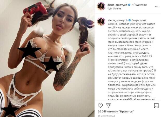 Сам по себе лифчик представлял белоснежные резинки, которые оплели ее стройную фигуру, а также подчеркнули пышную грудь. На бретельках вверху можно заметить игривый белоснежный пушок. Маленькие прозрачные трусики, так же как и лифчик состояли из резинок и кружевного цветочка. На стройных ножках, видимо, были надеты белые гетры с черными полосками, выглядывавшими на слегка обрезанном снимке. Омович сделала два игривых хвостика, а также красивый макияж. Девушка выставила язык и посмотрела в камеру. В ее руке торчал красный джойстик. В посте Алена рассказала о неприятном случае, связанного с ее хейтером. Оказывается, последний выставил фото модели с платного аккаунта у себя в сторис. "Хочу сказать, что выставлять скрины с моего платного аккаунта, и обсуждать контент, которым делюсь ЛИЧНО Я... и который даже пропустила инста ввиду того, что там ничего нет - гениально просто