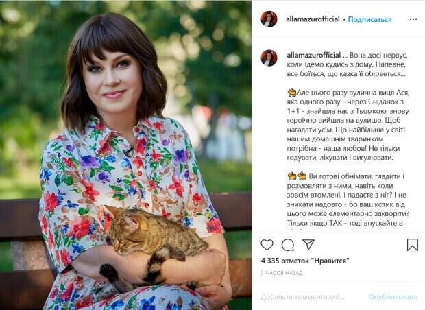 С тех пор Ася живет у них дома. «Она до сих пор нервничает, когда едем куда-то из дома. Наверное, все боится, что сказка ее оборвется ...Но в этот раз уличная киса Ася, которая однажды - через Завтрак с 1 + 1 - нашла нас с Темкой, снова героически вышла на улицу. Чтобы напомнить всем. Что больше всего на свете нашим домашним животным нужна - наша любовь! Не только кормить, лечить и выгуливать», - подчеркнула Мазур. Ведущая поделилась снимком, на котором она позирует на улице с кошкой на руках. На нем Алла выглядит счастливой и полной сил. Она добавила, что владельцы должны быть готовы принимать своих животных как детей – без каких либо условий, даже когда они безобразничают. «Принять их, как первого, или второго, или третьего своего ребенка. И любить без условий: даже когда делают вред. Это непросто, признаюсь) Но в этом, наверное, и есть наша ответственность», - подытожила ведущая. Украинцы бурно отреагировали на ее трогательную историю. «Вы очень нежная и красивая! Пусть Ангел-хранитель вас оберегает», «Здоровья Вам, и всего самого наилучшего», «Красивая женщина!!! Здоровья Вам Крепкого Алла!», «Супер летнее фото, прекрасная женщина, милота на руках, пусть всегда так будет», - пишут люди. Напомним, изменившаяся Алла Мазур после победы над раком показала свою новую гордость. Как сообщала Politeka, сын Аллы Мазур кардинально изменил внешность, фото: "Старалась убеждать, но...". Также Politeka писала, что победившая рак Алла Мазур поразила экстремальным отпуском с сыном.