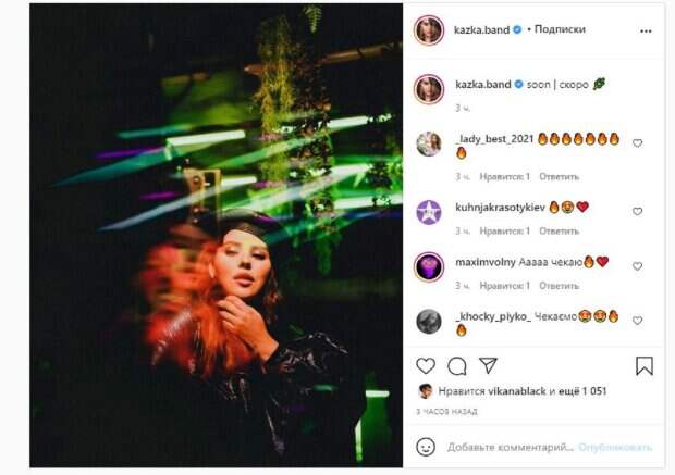 Но в этот раз Саша заинтриговала романтическим фото в темноте. Красотка стояла в черном наряде, а дополнила образ кожаным беретом. Фотограф сделал так, чтобы лучи света были в движении, как и сама Зарицкая. "Скоро", - лаконично на двух языках написала девушка, интригуя премьерой. Фанаты поставили чуть более тысячи лайков и написали комментарии: "Ждем", "Какая красивая", "Фото супер", "Когда ждать урожай?", "Не могу дождаться", "Мне нравится твоя шляпа". Мы писали, что солистка популярной группы KAZKA Александра Зарицкая показала необычные фото и приготовила украинцам приятный сюрприз. Новые снимки Саши получились весьма необычными и яркими, они сделаны с интересным розовым фильтром, который придает некой романтичности и легкости. Перед камерой певица появилась в оригинальном наряде, но больше всего внимания привлекает ее необычная прическа с косичками. Напомним, аппетитная солистка KAZKA довела публику до экстаза, покуражившись в прозрачных штанах Также Politeka сообщала, что пышнотелая солистка KAZKA понежилась в бассейне, пока никто не видел А еще Politeka писала, что фигуристая солистка KAZKA показала себя без грима, удивив внешностью в обычной жизни