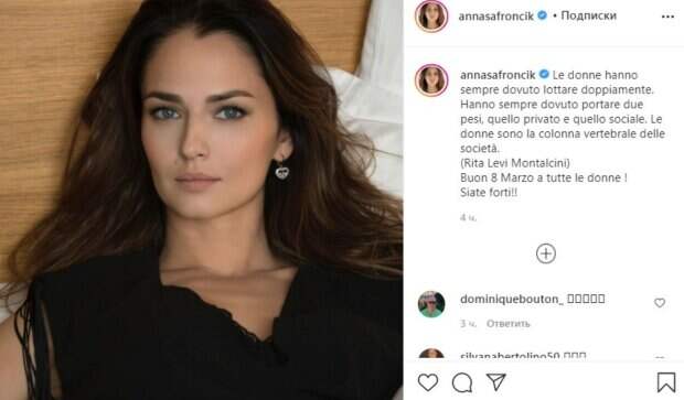 Одна из внучек живет в далекой Италии, ее зовут Анна Сафрончик. Девушка не пошла по стопам деда, предпочла карьеру модели и актрисы. Она уже успела сняться в нескольких фильмах и сериалах. Анна Сафрончик на своей странице делится с фанатами различными цитатами и мыслями. Каждое свое новое фото знаменитость сопровождает глубокомысленными изречениями, очень нравящиеся фанатам. Например, недавно Сафрончик опубликовала фотографию, где позирует в черном наряде. Сама красавица полулежит на подушках. Волосы Анна не стала собирать в прическу, а свободно распустила. В этот раз Анна выбрала цитату принадлежащую женщине, которая получила Нобелевскую премию за открытие в области физиологии и медицине. Это случилось в 1986 году. Звали ее Рита Леви Монтальчини. Знаменитость рассуждала о борьбе. Монтальчини говорила о том, что женщина является позвоночником общества, поэтому им приходится драться вдвойне. Одновременно женщина находится на двух ролях, частная и социальная. "Женщинам всегда приходилось драться вдвойне. Они всегда должны были нести два веса, частный и социальный. Женщины - это позвоночник общества. Счастливого 8 Марта всем женщинам! Быть сильными!!" - желает Анна Сафрончик. Напомним, внучка Чапкиса Анна покорила итальянцев своей красотой. Как сообщала Politeka, итальянская внучка Чапкиса показала кружевное белье. Также Politeka писала, внучка Чапкиса рассказала секрет своей красоты.