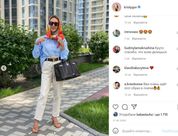 Она позировала в светлых джинсах и свободной голубой рубашке. Свой образ она дополнила шелковым платком, который повязала на голову. «Мода - это дело важное, но...Какой красивый наряд на себя не надень, если ты не относишься к себе с любовью и трепетом, то и выглядеть в нем по-особенному не будешь! А как только полюбишь и примешь себя, то вид будет на миллионы! Такой сделала для себя как-то вывод», - отметила Кристина. В комментариях Кристине оставили массу восторженных слов. «Вам очень идёт этот образ в платке», «Да! Конечно согласен! Хороших и модных выходных!», «100% согласна. Это действительно так!», «Какая красотка», «Стильная девушка», - пишут пользователи сети. Ранее мы писали, что Горняк решилась на необычную процедуру, чтобы оттянуть процесс старения. В этот раз ей сделали маску, которая заклеила рот. Напомним, что жена Остапчука в белоснежном платье с декольте показала гулянку с подругами: "Вечер перестает быть томным". Как сообщала Politeka, Остапчук "выдал" имя их будущего с Кристиной Горняк ребенка: "Моя ты мася". Также Politeka писала, что жена Остапчука в страстном образе показала, как смотрит на мужа: "Хочется, чтобы Вова вас так же любил".