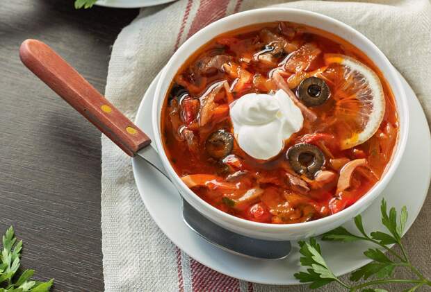 Солянка – что еще может быть вкуснее и калорийнее? Да, блюдо отнюдь не для тех дам, что считают каждую прибавленную килокалорию, но поверьте, от вкусно и правильно приготовленной солянки практически невозможно отказаться. В этом блюде всегда традиционно много различных ингредиентов и по тем же «канонам» должно быть много разнообразного мяса.