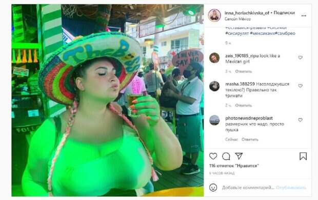 Как можно понять, девушка еще не уехала из Мексики, где сейчас активно проводит отпуск. Об этом пишет Politeka.net со ссылкой на страничку знаменитости. "Мексика, канун, текила, отдых, релакс", - написала тегами красотка под фотографией. Фанаты поставили чуть более ста лайков и написали комментарии: "Похожа на мексиканскую девушку", "Наслаждаешься текилой?) Правильно так держать", "размерчик что надо, просто пушка". Мы писали, что популярная отечественная модель Инна Горячковская показала себя во время путешествия в Мексику. На фото Инна показалась в красном мини платье с огромным декольте и без белья. Девушка дополнила образ пляжными тапочками и солнцезащитными очками, так как гуляла у берега моря. Напомним, бесстыжая украинка с 15-м размером в слишком маленьком купальнике "потеряла" бюст на пляже А еще Politeka писала, что украинка с 15-м размером бюста залезла в джакузи в бесстыжем купальнике Также Politeka сообщала, что украинка с 15-м размером бюста впечатлила роскошным преображением к весне
