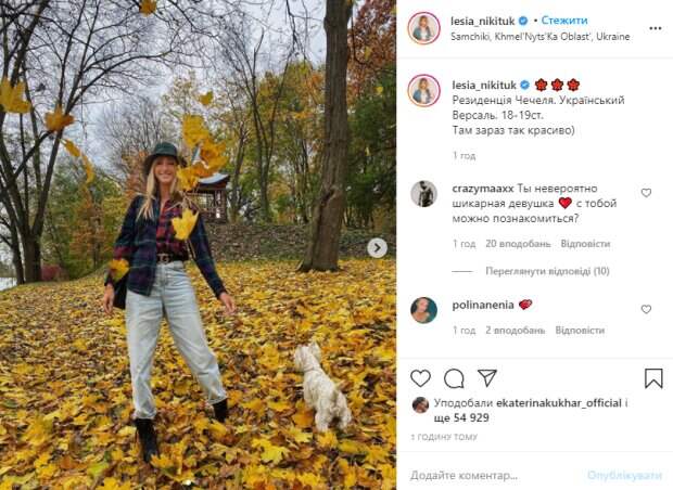 Телеведущая Леся Никитюк умеет приковать к себе восхищенные взгляды Как передает Politeka.net, 33-летняя звезда опубликовала свежие фото в своем микроблоге в Инстаграм, на которых предстала в осеннем лесу, утопая в желтом ковре из листьев. Леся в стильном образе позировала рядом с питомцем: на ней были светлые джинсы-момы, клетчатая рубашка сине-красного оттенка, заправленная наполовину, черные ботинки, ремень с крупной бляхой DG и синяя шляпка-панамка.