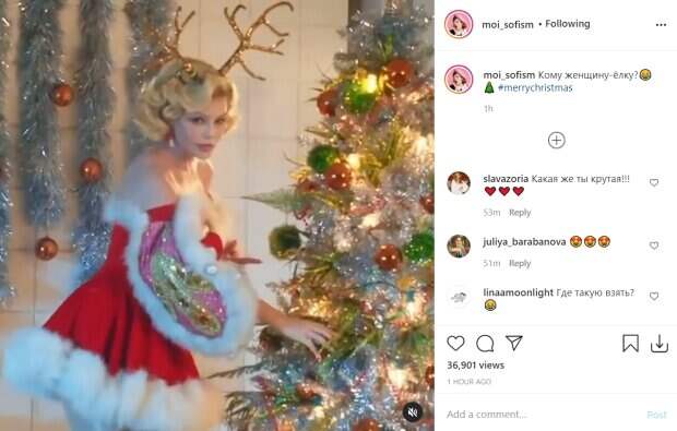 В одной из сцен Соня Плакидюк появилась в коротком красном платье, оттороченное белым мехом в стиле Санты Клауса, а голову украсила золотистыми оленьми рогами. Соблазнительный образ дополнил парик, превративший звезду в блондинку. Красотка порезвилась возле наряженной елки, коснувшись ее иголок. В другом фрагменте она очутилась в бокале в виде полосатой карамельки с черными распущенными волосами. Напоследок Соня Плакидюк предстала на кухне с высокой прической, украшенной шариками и блестками, на ней можно заметить белое платье без рукавов, которые заменили красные перчатки. Девушка игриво рассмеялась со стопкой в руках. "Кому женщину-ёлку?", - поинтересовалась Соня в описании. Пользователи соцсети узнали клип американской певицы Кэти Перри, которой Плакидюк приставила свое лицо при помощи монтажа: "Если бы я не знала, что клип Katy, то реально бы подумала, что у Сони вышла новогодняя песня"; "Почему мне здесь мерещатся Саша , Таня и Даша