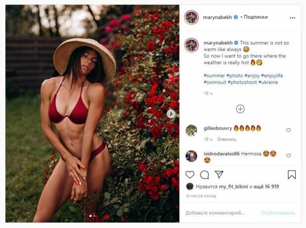 Об этом пишет Politeka.net со ссылкой на страничку знааменитости. "Это лето не такое теплое, как обычно. Так что теперь я хочу поехать туда, где действительно жарко", - написала Марина. Фанаты поставили почти 17 тысяч лайков и написали комментарии: "Прекрасная", "Ну, теперь они похожи на миниатюрные розы", "Красную руту не ищи вечерами ...", "Удивительная женщина", "Не замерзла", "Жаль, что тело, является скульптурой и на протяжении многих лет будет повреждено", "Абсолютная красота", "Манекенщица", "Но тебе достаточно согреться летом". Сообщалось, что известная украинская легкоатлетка Марина Бех-Романчук сверкнула идеальным телом во время тренировки. «Просто наслаждаюсь», — коротко говорится в сообщении. Обратим внимание, что на снимке Бех-Романчук позирует во время тренировки, демонстрируя безупречную фигуру в спортивном наряде. «Красивая картина», «воу воу воу», «ты выглядишь счастливой», «очень мило выглядишь», «красотка», - написали фанаты. Напомним, роскошная Марина Бех-Романчук скинула белье и показала свою душу во всей красе А еще Politeka писала, что фигуристая Бех-Романчук выставила напоказ пятую точку в бикини, поза впечатляет Также Politeka сообщала, что соблазнительная Бех-Романчук прикрыла свой стыд шикарным букетом цветов