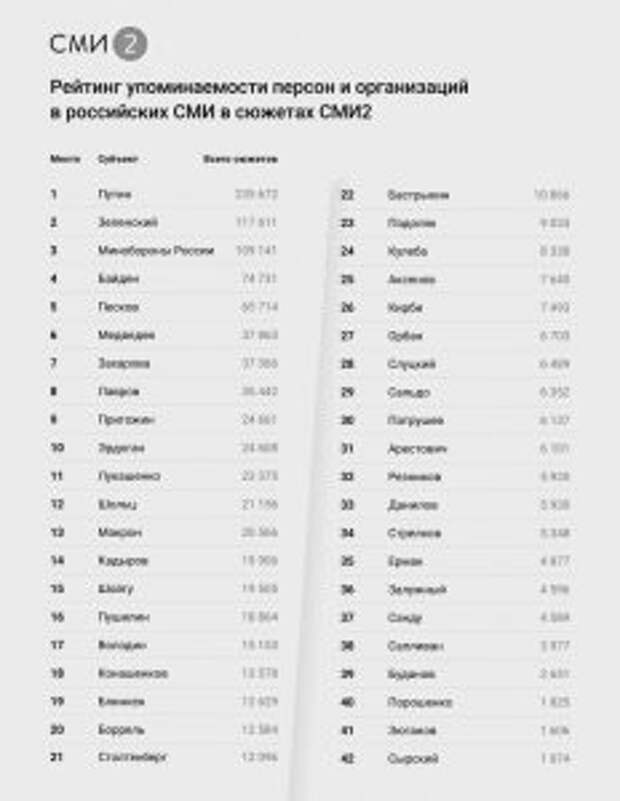 Для анализа эксперты использовали более 11 миллионов популярных сюжетов, образовавшихся за 15 месяцев СВО. Массив информации из новостного агрегатора был помещен в систему полнотекстового поиска, чтобы отобрать главных ньюсмейкеров РФ, Украины, Америки и Европейского союза, транслирующих свою позицию по международной напряженности. После этого был создан рейтинг упоминаемости спикеров в сюжетах агрегатора СМИ2. После составления рейтинга упоминаемости персон, были исследованы их цитаты и тональность подачи в отечественных медиа. Для этого аналитики создания код считывания языковых форм выражения точки зрения. Перед сбором данных был сформирован скрипт, совершающий автоматические запросы, представленные в формате регулярных выражений, и систематизирующий итоги работы в таблице. При помощи таблицы получилось узнать, каков процент выражения российской и антироссийской позиций в статьях СМИ, работающих в России. Таким образом выяснилось, что лидером по популярности в отечественных изданиях является глава РФ Владимир Путин. Далее располагаются президенты Украины и Соединённых Штатов Америки — Владимир Зеленский и Джозеф Байден. А на трансляцию антироссийской позиции в медиа в России приходится лишь порядка 30% от всех цитируемых спикеров. Сообщение В СМИ2 сообщили, что недружественный нарратив проникает в медиаповестку через инфоповоды появились сначала на Общественная служба новостей.