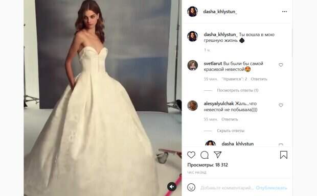 А когда пара отправилась регистрировать ребенка, Михайлюк организовал им спонтанную роспись. Теперь возлюбленные официально женаты, однако как таковой свадьбы у них не было. Как пишет Politeka.net, в новом посте на своей странице в Инстаграм Хлистун неожиданно предстала в образе настоящей невесты. Так, на видео девушка демонстрирует перед камерами роскошное свадебное платье с открытыми плечами, корсетом и пышной юбкой. При этом неизвестно, как давно были сделаны эти кадры. В комментариях подписчики выразили сожаление в связи с тем, что Даше не довелось примерить образ невесты для собственной свадьбы. «Жаль...что невестой не побывала», - написала одна девушка. «А кто сказал что не буду?», - загадочно ответила на это Хлистун. Другие подписчики также активно комментируют пост. «Вы были бы самой красивой невестой», «Очень красивая», «Класс», «огонь», - пишут люди. Напомним, жена "Холостяка" Михайлюка удивила откровением о своей тайной свадьбе. Как сообщала Politeka, "холостяк" Михайлюк сыграл тайную свадьбу, появились кадры: жених в шортах и невеста в мини. Также Politeka писала, что жена "Холостяка" Михайлюка в платье с разрезом огорошила признанием.