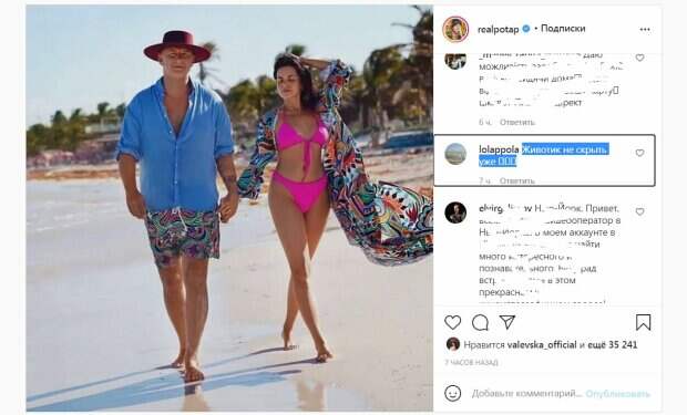 На фото Настя была в розовом бикини, она шла прикрыв глаза. А муж артистки надел пляжные рубашку и шорты. Пара держалась за руки. "Я оставил свое сердце в Мексике", - написал Потап. За семь часов публикация собрала более 30 тысяч лайков. Примечательно, что некоторые пользователи сети заметили у Каменских животик и заговорили о беременности. "Животик не скрыть уже