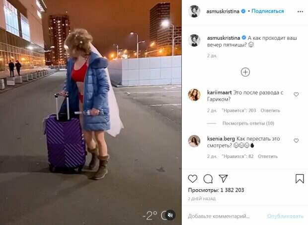 При этом в руках у нее бутылка водки. В комментариях под видеороликом поклонники тогда предположили, что Кристина Асмус пустилась во все тяжкие после развода с Гариком Харламовым. Позже стало известно, что это были кадры из нового фильма "Булки", в котором снялась Кристина Асмус. "Булки. Комедия про женское счастье", - говорится в подписи к видеоролику, на котором зареванная и пьяная Кристина Асмус тащит чемодан по земле, и выкривает озлобленные фразы. "Я, мать вашу, заслужила увидеть океан", - выкрикивала Кристина Асмус в трусах. "Путь к счастью русской девушки очень простой", - добавила героиня Асмус в видеоролике. Ранее Кристина Асмус призналась, как разочаровалась в людях. Так, Асмус призналась, что чувствует себя ужасно из-за разочарования в людях. «Зонт сейчас очень хорошо отражает моё состояние. Меня просто выворачивает…Слишком большая концентрация г*на за эти дни. Как же мало людей среди людей...Каждый раз на какое-то чудо надеюсь. Но жизнь отрезвляет все больнее и больнее...», - написала актриса и опубликовала фото, сделанное на улице при сильном ветре. Напомним, Кристина Асмус показала маму, на которую таит обиду, откровения звезды. Как сообщала Politeka, зареванная Кристина Асмус в трусах вызвала волну сочувствия Также Politeka писала, что мама Кристины Асмус поразила внешностью рядом с дочерью