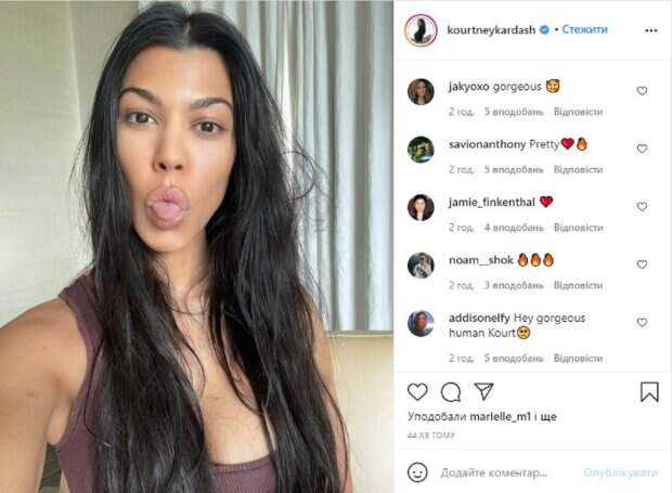Похудевшая модель своей выходкой, наверняка лишила сна своих истинных почитателей, которых у знаменитости 113 миллионов человек. Ее снимок говорит лишь о том, что у девушки прекрасное настроение, и она готова к новому дню в чудесном расположении духа. Многие поклонники прокомментировали снимок Кортни словам похвалы, любви и воспевании ее очаровательной внешности. "Великолепная", "Какая милая", "Кортни, ты моя любимая", "Посылаю вам много любви и положения в вашей жизни", "Если бы вы ответили, это была бы мечта", "Люблю тебя, я твой поклонник", написали поклонники. Дерзкая 41-летняя красотка недавно заявила, что готова к более зрелым отношениям. В сети обсуждают ее роман с музыкантом, барабанщиком, Трэвисом Баркером. По сообщениям инсайдеров, у Кортни и Трэвиса долгая, долгая история и годы дружбы. Не так давно мы писали, что Кортни оригинально посмеялась над фотосессией сестер – Ким, Кайли и Кендалл, которые в одинаковом белье решили прорекламировать бренд одежды и не пригласили ее саму. Напомним, что миллионерша Кортни Кардашьян решилась показать, как выглядела до пластики лица и бюста: "Плохая девочка". Как сообщала Politeka, аппетитная Кайли Дженнер в ниточках белья потрогала себя в интимных местах: "Мой любимый способ…". Также Politeka писала, что похудевшая Кортни Кардашьян в мини-бикини превзошла сестер, блеснув ягодицами: "Ого, как помолодела".