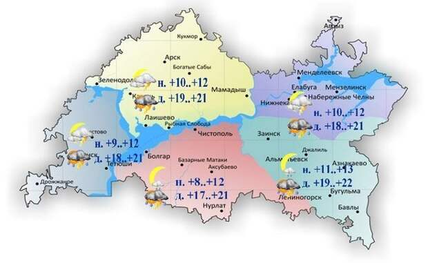 Сегодня в Татарстане ожидается облачная погода с прояснениями. Синоптики прогнозируют кратковременные дожди, местами грозу. Утром в отдельных районах может образоваться туман. Об этом предупреждает Гидрометцентр республики. Днем температура воздуха в Казани составит +19..+21 градус, в Набережных Челнах +18..+21 градус, в Альметьевске +19..+22 градуса, в Чистополе +17..+21 градус, в Буинске +18..+21 градус. Фото: realnoevremya.ru (архив) Также синоптики прогнозируют сильный ветер, днем местами порывами до 15-20 м/с. Согласно предварительному прогнозу Гидрометцентра Татарстана, в конце недели в республике осадки маловероятны. Ночью температура воздуха опустится до -2..+3 градусов, а днем потеплеет до +8..+13 градусов.