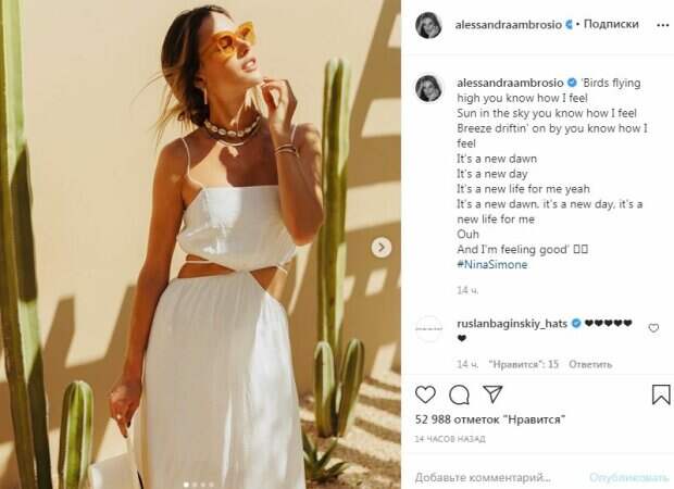 Красотка предстала в белом платье на тончайших бретельках, которые почти соскальзывали с ее шелковых плечей. Вырезы по бокам, оголяли идеальный животик, а юбка наряда подчеркнула красивые бедра. В руках знаменитость держала шляпку, а на шею она надела ожерелье из ракушек. Стильные очки дополнили образ. "Птицы, летающие высоко, знают, как я себя чувствую Солнце в небе, ты знаешь, как я себя чувствую Ветерок, ты знаешь, как я себя чувствую Это новый рассвет Это новый день Это новая жизнь для меня, да Это новый рассвет, это новый день, это новая жизнь для меня Ах, и мне хорошо", - написала модель. За 14 часов пост собрал более 50 тысяч лайков и много комментариев. Пользователи сети написали много комплиментов. Ранее мы писали, что Алессандра Амбросио покорила формами на пляже, нарядившись в крохотное бикини. Знаменитость надела маленький купальник розового цвета, который подчеркивал и оголял самые пикантные места. Красотка также взбудоражила эффектным ракурсом, встав перед фотографом полубаком. Напомним, Алессандра Амбросио продемонстрировала изящные формы в микро-бикини сиреневого оттенка. Купальный наряд держался на тончайших бретельках, а посередине имелся небольшой разрез, из которого немного выглядывал бюст. Напомним, что модель Алессандра Амбросио в пикантном купальнике подразнила аппетитными изгибами: "Русалка!". Как сообщала Politeka, Алессандра Амбросио в крохотном бикини соблазнила упругим телом: от вида захватывает дух. Также Politeka писала, что Алессандра Амбросио подразнила сочными изгибами, задрав руки в микроскопическом купальнике: «Ярче солнца!».