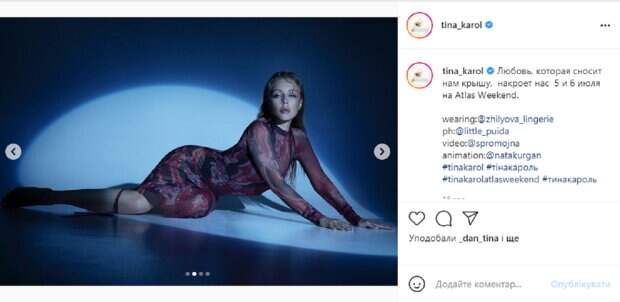 Известная певица Тина Кароль стала героиней необычной фотосессии в рамках промо к фестивалю Atlas Weekend Как сообщает Politeka.net, на фан-странице в Instagram, посвященной певице Тине Кароль, опубликовали необычные фото и видео, на которых звезду можно увидеть в соблазнительном образе. В коротком смонтированном ролике она демонстрирует свои обольстительные изгибы и кидает томные взгляды в камеру, а на фотографиях показывает оригинальны прозрачный наряд.