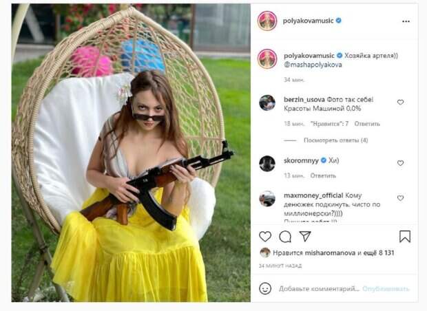 На кадре Маша сидела в прозрачном платье в кресле, надев стильные очки. В руках у девушки был автомат, который Полякова отвела в сторону от камеры. Интересно, что в платье декольте оказалось довольно смелым и бюст был почти не прикрыт. Фанаты поставили более 8 тысяч лайков и написали комментарии: "Фото так себе. Красоты Машиной 0.0%", "Ну, да, яблоко от яблони, правду говорят", "Зря вы выставляете свою девочку в такой ипостасии. Ей рано еще", "Опасная леди", "Маша ты огонь и никого не слушай детка, это просто зависть... Успехов тебе!". Напомним, дочь Поляковой высказала украинцам, что о них думает после шквала негатива А еще Politeka сообщала, что 16-летняя дочь Оли Поляковой устроила шоу под Моргенштерна, в сети ахнули Также Politeka писала, что юная дочь Поляковой смутила видом, потянув за бретельки бюстгальтера