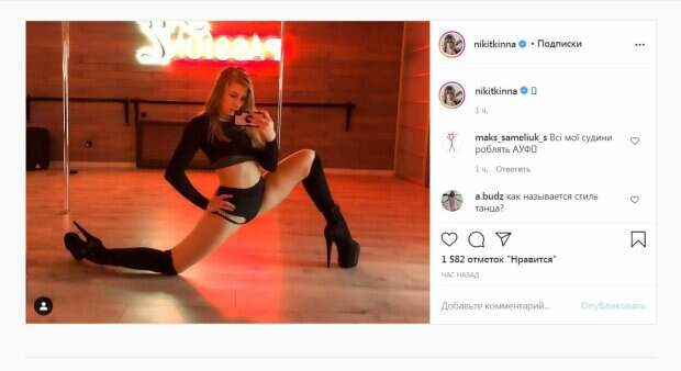 Длина одежды позволила полюбоваться идеальным прессом красотки. Также звезда надела черные шортики, которые напоминали трусики. Черные длинные гетры и ботинки на длинных шпильках и больший платформе - завершили дерзкий образ. Красотка села перед зеркалом, широко расставив ножки. Она смотрела в телефон и распахнула губы. В подписи артистка поставила простой смайлик: "