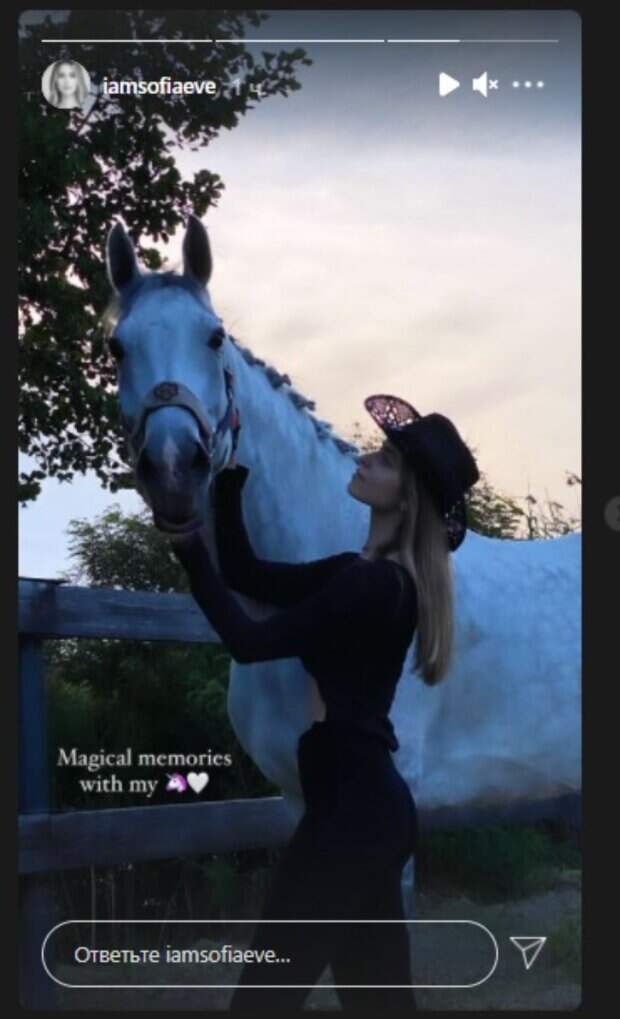 Свою первую бронзовую медаль на соревнованиях по конкуру Соня завоевала в 12 лет. Тогда София Михайловна подарила ей коня по кличке Набат. "Это был внезапный подарок, ни к чему не приуроченный сюрприз, так просто бабушка подарила", - рассказывала Соня. К слову, тренировки у тогда еще школьницы проходили два раза в неделю, на выходных. Несмотря на то, что девушка уже давно не живет в Украине - сначала училась в Лондоне, а окончив там два класса старшей школы, переехала в Нью-Йорк, где продолжила грызть гранит науки во всемирно известной школе дизайна «Парсонс» - до сих пор увлекается лошадьми. Внучка Ротару частенько делится с поклонниками кадрами конных прогулок. В этот раз девушка предстала рядом с белым конем, обнимая того за морду. Модель сверкнула стройной фигурой в обтягивающей кофточке и штанах черного цвета. Ковбойская шляпка придала ее образу пикантности. "Волшебные воспоминания с моим