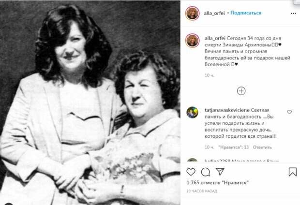 "Сегодня 34 года со дня смерти Зинаиды Архиповны. Вечная память и огромная благодарность ей за подарок нашей Вселенной", - говорится в подписи к трогательному снимку. Пользователи решили поддержать российскую примадонну и оставили ей десятки комментариев под публикацией. "Светлая память", "Пусть земля ей будет пухом...", "Мама, самый любимый человек, подружка, самая, самая, нет ближе никого, и она всегда останется в сердце", "Грустно", "Мама, самое родное слово,самый родной человек. Всем, живым, мамам здоровья, и светлая память ушедшим", "Светлая память Зинаиде Архипов не и спасибо ей за талантливую прекрасную дочь Аллу Борисовну Пугачеву!", "Светлая память, царство небесное!", "Эту фотографию я видела в журнале у своей мамы.Они здесь,как будто мне родные.Мамы тоже уже нет с нами.Светлая и вечная память память нашим мамам.А Алле Борисовне активного,творческого долголетия!", "Она подарила России звезду, таких пока больше нет, вся надежда на Кристину", - оплакивают фанаты мать Аллы Пугачевой в Instagram. Ранее мы рассказывали, как Алла Пугачева удивила молодежным образом. Она была одета в пышную красную юбку, которая больше напоминала наряд клоунессы, чем костюм певицы. На ногах у артистки красовались черные кеды, а голову украшала необычная черная шляпка. Копна волос выглядывала из-под головного убора. «Помните у Аллы Борисовны Пугачевой "Миллион, миллион, миллион алых роз..."? А вы не задумывались, миллион роз - это сколько?», - подписали авторы аккаунта фото. Напомним, что Пугачева дерзко оголила плечико, наплевав на возраст: "Бунтарь, всем врагам назло". Как сообщала Politeka, ослепительная Пугачева сорвалась на публике рядом с Галкиным: "Как вы мне надоели!". Также Politeka писала, что Пугачева в прозрачной юбке произвела фурор стройными ногами: «Как такое возможно в 70 лет?».