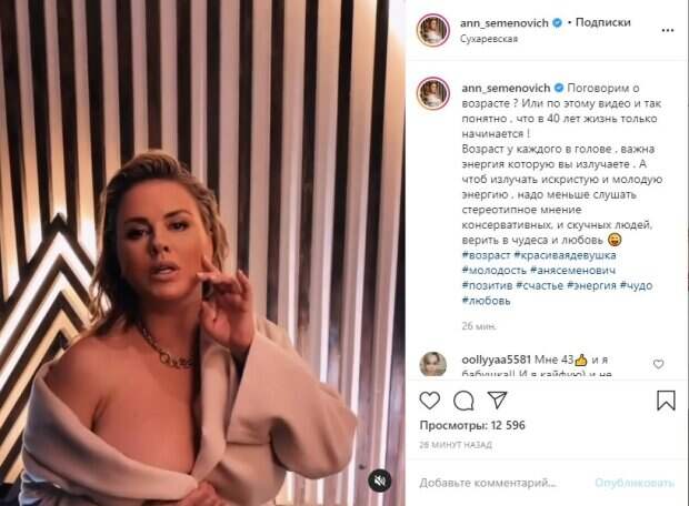 Семенович решила пококетничать с фанатами и спросить у них, как они относятся к зрелым годам. "Поговорим о возрасте ? Или по этому видео и так понятно , что в 40 лет жизнь только начинается ! Возраст у каждого в голове , важна энергия которую вы излучаете . А чтоб излучать искристую и молодую энергию , надо меньше слушать стереотипное мнение консервативных, и скучных людей, верить в чудеса и любовь