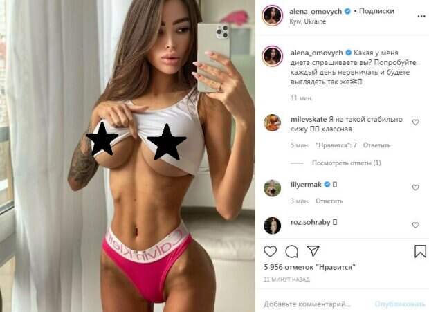 Красотка заодно и показала свою стройную талию, упругий живот и красивые бедра, на которых держались розовые трусики от известного бренда. Омович слегка выгнулась, выставив назад упругие ягодицы. Модель смотрела в телефон, снимая себя в зеркало. "Какая у меня диета спрашиваете вы? Попробуйте каждый день нервничать и будете выглядеть так же☠️
