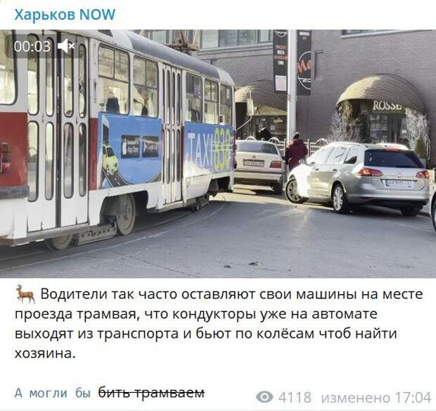 Возле Сумского рынка в Харькове припаркованный автомобиль заблокировал движение трамваев Об этом сообщили очевидцы в телеграмм-канале "Харьков now". "Водители так часто оставляют свои машины на месте проезда трамвая, что кондукторы уже на автомате выходят из транспорта и бьют по колесам, чтобы найти хозяина", - сообщил автор публикации.