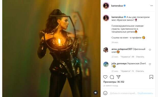 Об этом пишет Politeka.net. Так, артистка раскрыла, какие ощущения хотела передать в этом клипе. «А вы уже посмотрели мое «Красное вино»? Головокружительное слияние страсти, чувственности и танцевальных ритмов», - написала Настя. Она также поделилась отрывком из музыкального видео. На нем певица соблазнительно двигается под музыку в роскошных нарядах. Так, в клипе Каменских можно увидеть в блестящем боди с глубоким декольте. Из-за крупных пайеток цвет наряда определить очень трудно, ведь он постоянно меняется в зависимости от падающего на него света. Для второго образа певица выбрала красное платье с юбкой, украшенной бахромой, из-за которой ноги Насти остаются открытыми. Поклонники тут же принялись комментировать пост певицы. При этом, многим клип Каменских показался похож на работы российской певицы Zivert. «Офигенный клип», «Закос под Зиверт и явный», «Не удержалась от комментария что то очень на Zivert похоже», «Я сначала подумала что Зиверт поёт ну уж очень манера пения похожа», «Похудей немношко», «Целый день на повторе», «Боже, я с самого утра начала слушать все песни. Все очень классные», «Не могла отвести глаз», «И талантливая, и красивая, и харизматичная, и петь умеет ну нафига этот плагиат на Зиверт, хоть убейте не понимаю? », - пишут люди. Напомним, отец Насти Каменских после смерти является к ней во снах: "Попросила вселенную". Как сообщала Politeka, Каменских в красном корсете и с "вампирскими" глазами потешила экс-жену Позитива: "Устоять невозможно". Также Politeka писала, что Настя Каменских в откровенных нарядах устроила сеанс соблазнения: "Я танцую, ты смотри".