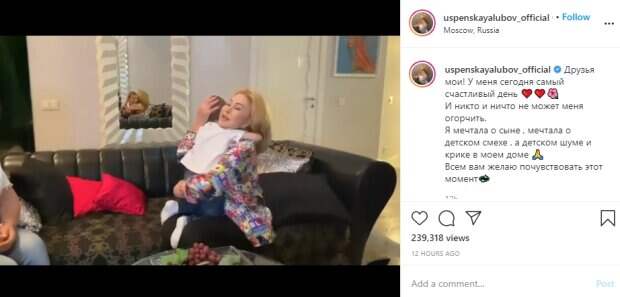 Ребенок сам подошел к знаменитости и с улыбкой поцеловал ее, а после этого весело похлопал в ладоши вместе с певицей. Немалую интригу вызвали слова женщины, которая передала мальчика Успенской: "Вы так сильно просили хорошего мальчика, о котором вы мечтали. И вот мы нашли самого лучшего ребенка на свете, получайте его, пожалуйста". Сама исполнительница тоже не стала молчать, она прижала малыша к себе и сказала: "Моя деточка. Тебе нравится здесь? Ты останешься в этом доме? Это все твое". В описании к видео 66-летняя Любовь Успенская тоже поделилась своей радостью и ошеломила известием о ребенке. "У меня сегодня самый счастливый день ❤️❤️🌺 И никто и ничто не может меня огорчить", - заявила звезда. - "Я мечтала о сыне, мечтала о детском смехе, а детском шуме и крике в моем доме 🙏 Всем вам желаю почувствовать этот момент💫". В комментариях многие поздравили Любовь Успенскую с таким неожиданным событием, даже Николай Басков не сдержался и пожелал ее сыну расти счастливым и здоровым. У многих возник вопрос, уж не усыновила ли певица мальчика, но знающие люди раскрыли правду. Оказалось, в гости к Успенской приехала Милана Тюльпанова, бывшая жена футболиста Александра Кержакова, она привезла с собой сына Артема, который приходится исполнительнице крестником. "Не поняла? Усыновили мальчика..."; "Может, Любовь стала крестной матерью?"; "нет, это сын Тюльпановой и Кержакова😁 Милана в гости к ней приехала с сыном😄"; "это ее крестник"; "крестная"; "Это Артем, сын Кержакова"; "у этого мальчика есть родители и с ними все хорошо, в отличии от Любы"; "крестный сын - он навсегда☝🏻", - пишут комментаторы. Ранее в сети появились слухи о романе Успенской с поп-королем Филиппом Киркоровым. Певица сама подогрела их откровенным заявлением после скандала со знаменитым коллегой по эстраде. Она намекнула, что дело идет к свадьбе, хотя сама состоит в браке с Александром Плаксиным: «Мы друзья, может, еще даже и поженимся. А чего тушеваться? Он же любит талантливых. Так что я не против». Напомним, дочь Успенской накинулась на мать с новыми обвинениями: "Меня преследуют и...". Как сообщала Politeka, Успенская напугала всех новой внешностью, уколы красоты не помогли. Также Politeka писала, что Успенская не удержалась и заговорила о романе с Путиным: "Хотел разрушить мою жизнь".