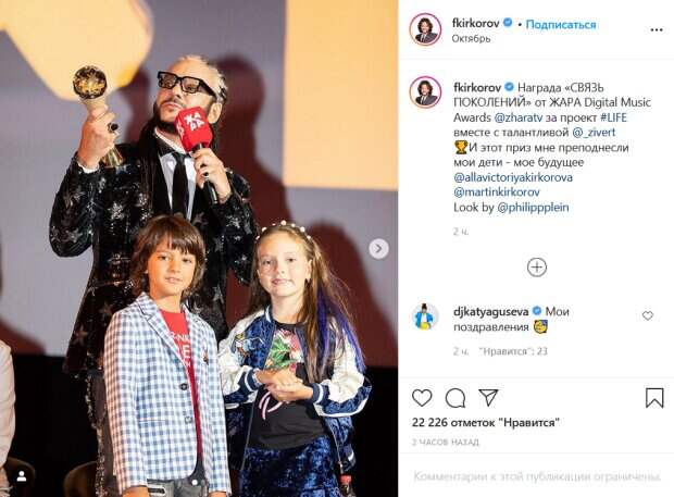 Филипп Киркоров вывел в свет своих подросших детей и похвастался новой наградой Знаменитый российский певец поделился новыми снимками в своем Инстаграм. Об этом пишет Politeka.net. Как стало известно, Киркоров появился на музыкальной премии «ЖАРА Music Awards». Артист победил в номинации «Связь поколений» и получил соответствующую награду из рук собственных детей – Аллы-Виктории и Мартина.