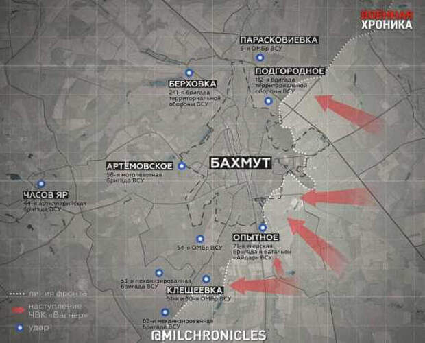 После прибытия в Бахмут (Артёмовск) сотрудников ЧВК США «Моцарт» (Mozart Group), о которых Военная хроника сообщала ранее, а также подкреплений ВСУ с Херсонского направления планирование атаки возобновилось под руководством американских офицеров. Однако при попытке провести операцию и вскрыть огневой район ЧВК Вагнера и НМ ДНР погибли не менее 75 (по другим данным — 95) военнослужащих 13, 15 и 16-го мотопехотных батальонов 58-й бригады, а также боевики из 46-го штурмового батальона «Донбасс», что говорит о неверном понимании боевых возможностей союзных сил американскими военными. При отходе подразделений на исходные позиции с помощью беспилотников удалось установить расположение полевых штабов и импровизированных казарм, обустроенных как в Бахмуте, так и в ближайших пригородах. После доразведки целей «оркестру» удалось поразить штабы и склады с вооружением 241-й бригады территориальной обороны в Берховке и Парасковиевке, а также ряд других критически важных объектов ВСУ в пригородах Бахмута, включая центр управления огнём 44-й артиллерийской бригады ВСУ в Часовом Яру. По данным радиоперехвата ВСУ, после удара украинские военные срочно запросили подкрепление в штабе командования «Восток». Потери ВСУ в ходе нанесения ударов, по предварительным данным, составили от 150 до 250 человек, что особенно ощутимо на фоне потока «двухсотых» с начала ноября. Нарушенная связь и управление войсками уже привели к дезорганизации обороны окраин города, и при сохранении темпов наступления ЧВК Вагнера это может спровоцировать обрушение фронта ВСУ на северном, северо-восточном, восточном и юго-западном участках.