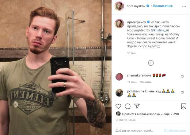 На снимке звезда позирует в футболке у себя в ванной комнате. Артист стал перед зеркалом, навел камеру и запечатлел себя. А в подписи к кадру он сообщил, что в скором времени выйдет его новый видеоклип, который они уже отснимали. «Я так часто пропадаю, но так ярко появляюсь» (copyrighted by @kristina_si) Чувачечечки, наш кавер на Motlëy Crüe - Home Sweet Home готов! И видос мы сняли охренительный! Ждите, скоро будет!)))», - написал Никита. Фолловеры не прошли мимо и уже отреагировали на новый снимок музыканта. "Никита тебе идёт борода и усы!