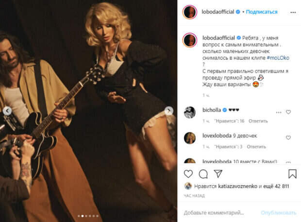 На одном из снимков красотка впритык придвинулась к гитаристу, блеснув аппетитной красотой прямо перед его носом. Светлана застыла в танце, обхватив талию руками и слегка расставив ножки. На еще одном фото Лобода обескуражила неестественной позой: девушка, будучи на шпильках, сильно прогнулась назад - казалось, что она может вот-вот упасть. Ее мышцы заметно напряглись, а платье приспустилось, немного обнажив "запретный плод". "Ребята, у меня вопрос к самым внимательным. Сколько маленьких девочек снималось в нашем клипе #moLOko? С первым правильно ответившим я проведу прямой эфир