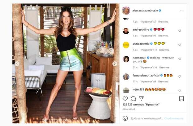 Сейчас девушка ведет активно Инстаграм, делясь интересными фото. На новом снимке, который Амбросио добавила в Инстаграм, красотка позировала в топе и юбке, а образ дополнила стильными очками. Алессандра стала на коленки, демонстрируя роскошную фигурку. На других фото девушка показалась на среднем плане и в полный рост. "Тут жарко", - подписала фото Амбросио. Фанаты поставили более 100 тысяч лайков и написали комментарии: "Так весело танцевать с тобой", "тает - где бы ты ни была", "Ты мне душу греешь", "Шикарный наряд !!!", "Такой красивый ангел", "Ты потрясающе выглядишь", "Люблю вас!!! Спасибо за новое фото", "Идеально в моей жизни". Сообщалось, что тзвестная модель Алессандра Амбросио во время необычной домашней съемки показала идеальную фигуру. Модель подчеркнула фигуру минимумом одежды и простыми деталями. При этом сияющий вид модели часто вызывает вопросы у поклонников: звезда выглядит значительно моложе своих лет. Напомним, 40-летняя экс-ангел Victoria’s Secret в экстремальном мини показала главную гордость А еще Politeka писала, что 40-летняя экс-ангел Victoria’s Secret изумила фигурой в маленьком бикини Также Politeka сообщала, что экс-ангел Victoria’s Secret в мокрой одежде показала, как превзойти молоденьких моделей в 40 лет