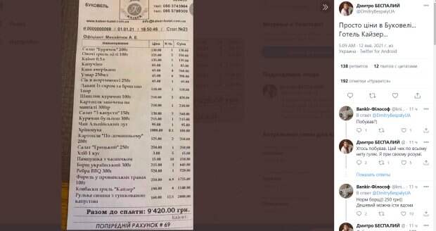 В сети показали счет одного из заведений в Буковеле Как передает Politeka.net, соответственный снимок чека с ресторана на украинском курорте опубликовал журналист Дмитрий Безпалый в Twitter. "Просто цены в Буковеле", - лаконично сообщил он в подписи к посту. На опубликованном фото видно, что компания посидела в заведении на 9420 гривен.
