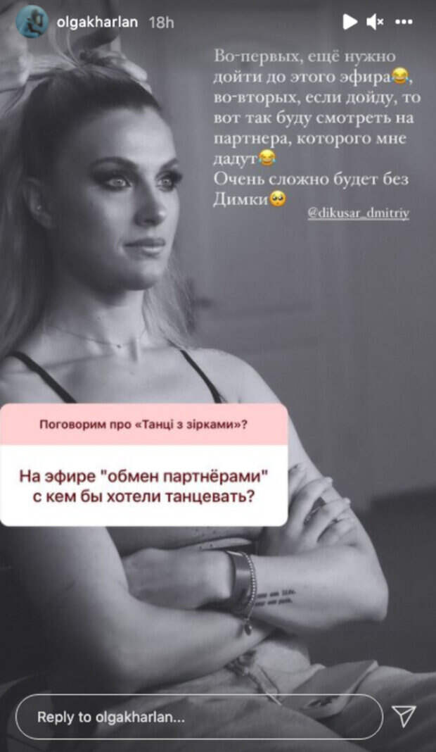 На прошлом эфире именно пара Ольги Харлан и Дмитрия Дикусара прошла в тройку лидеров. Так, на своей странице в Инстаграм Ольга Харлан рассказала грустную новость. Как известно, на шоу состоится эфир "Обмен партнерами". Поклонники спросили у Ольги, с кем она хотела танцевать на таком эфире. "Во-первых, еще нужно дойти до этого эфира. Во-вторых, если дойду, то вот так буду смотреть на партнера, которого мне дадут. Очень сложно будет без Димки", — с грустью заявила Ольга Харлан. Также, её спросили, дойдет ли она до финала шоу "Танці з зірками". "Очень хочется", — ответила Ольга. Ранее сообщалось, экс-муж Билык и Шоптенко Дикусар в объятиях партнерши Харлан сам напросился на критику: "Это всё для..." Также, Харлан честно рассказала о трудностях на "Танцях з зірками" в паре с Дикусаром: "Пока из них всех..." Politeka рассказывала, Дикусар сделал признание после эфира "Танців з зірками", зацепив экс-партнершу Сумскую: "За твои слова..."